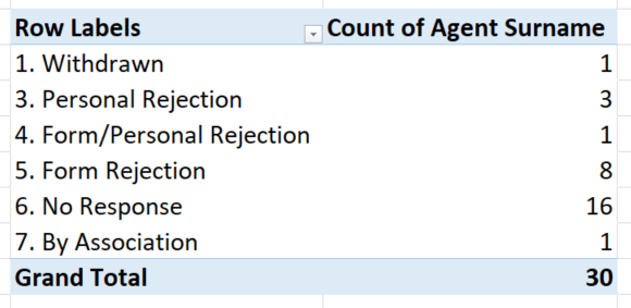 Finally, with version 1.16 (which is now the blurb on ebook sites), I took the plunge and sent out the initial queries. I queried 28 agents in the first month. And the responses flew in, then trickled in, then disappeared. And all of it was rejection.