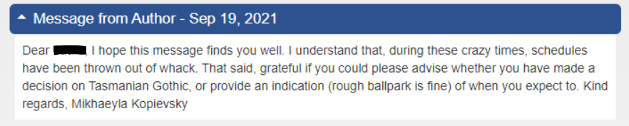 In September 2021, ten months after I had submitted the full manuscript for consideration, I sent a message via Query Manager: