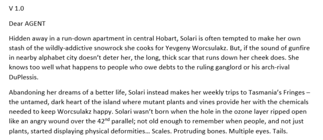Finally – after a small hiatus while I finished Rebellion and finalised the stupid tense changes, and successive revisions and edits – Tasmanian Gothic was ready to be queried. I was so excited. Here was a story I loved, that was dark and quirky and different, that was perfect for fans of China Mieville, Jeff Vandermeer, and Kameron Hurley – with its morally questionable protagonist, punk vibes, bug-punk mutant weirdness, and a roadtrip across a divided and war-torn Tasmania. Someone was sure to pick it up. Right?