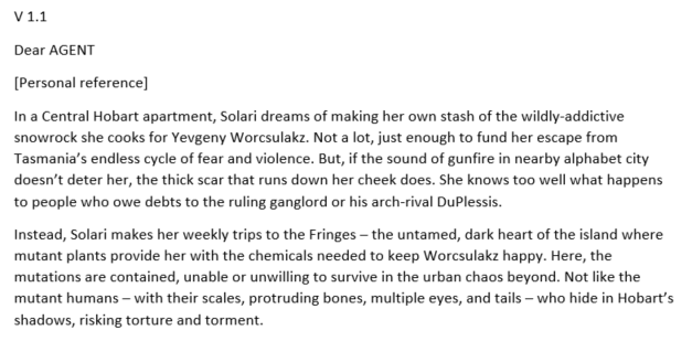 A couple of months after submitting the full manuscript, I contacted the agent to let them know I was considering submitting a short story to Grimdark Magazine that was set in the same world as Tasmanian Gothic and using the same characters, and wanted to know what impact this would have on my chances of future publication and what boundaries I needed to be aware of (i.e. okay to use the same world, but not characters, or okay to use characters, just not the main ones).
