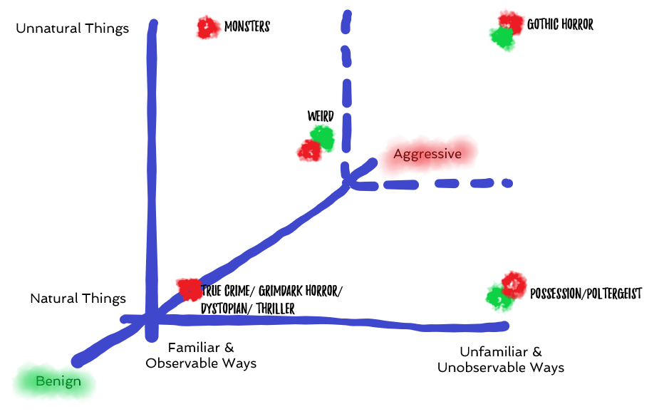 Where we have unnatural things behaving in unnatural (or inexplicable) ways we have supernatural and paranormal genres and modes like Gothic Horror. Sometimes we can observe the unnatural intent (a malicious haunting, for example), but sometimes the intention is unclear – and the result is more unsettling and terrifying, than openly horrifying. Horror is fear you can put a name to, Terror is fear you can’t reduce to words.